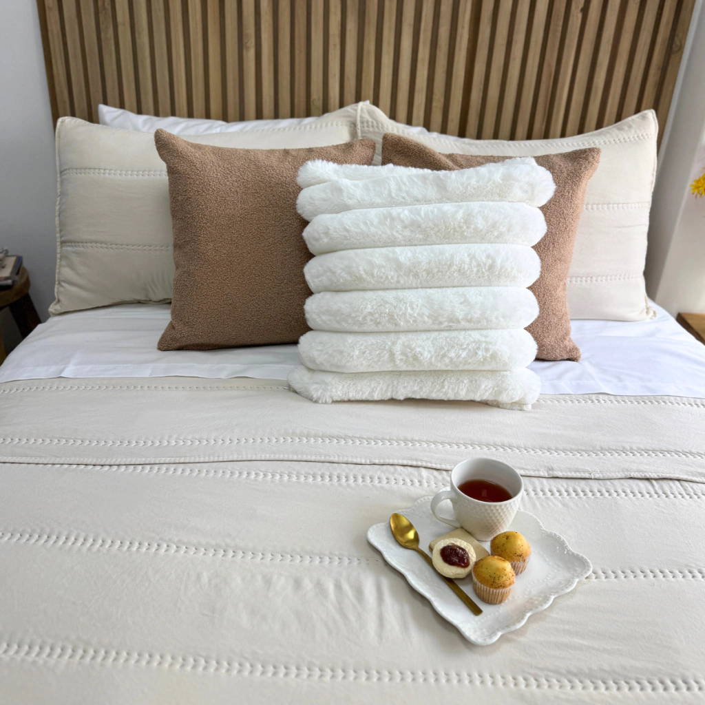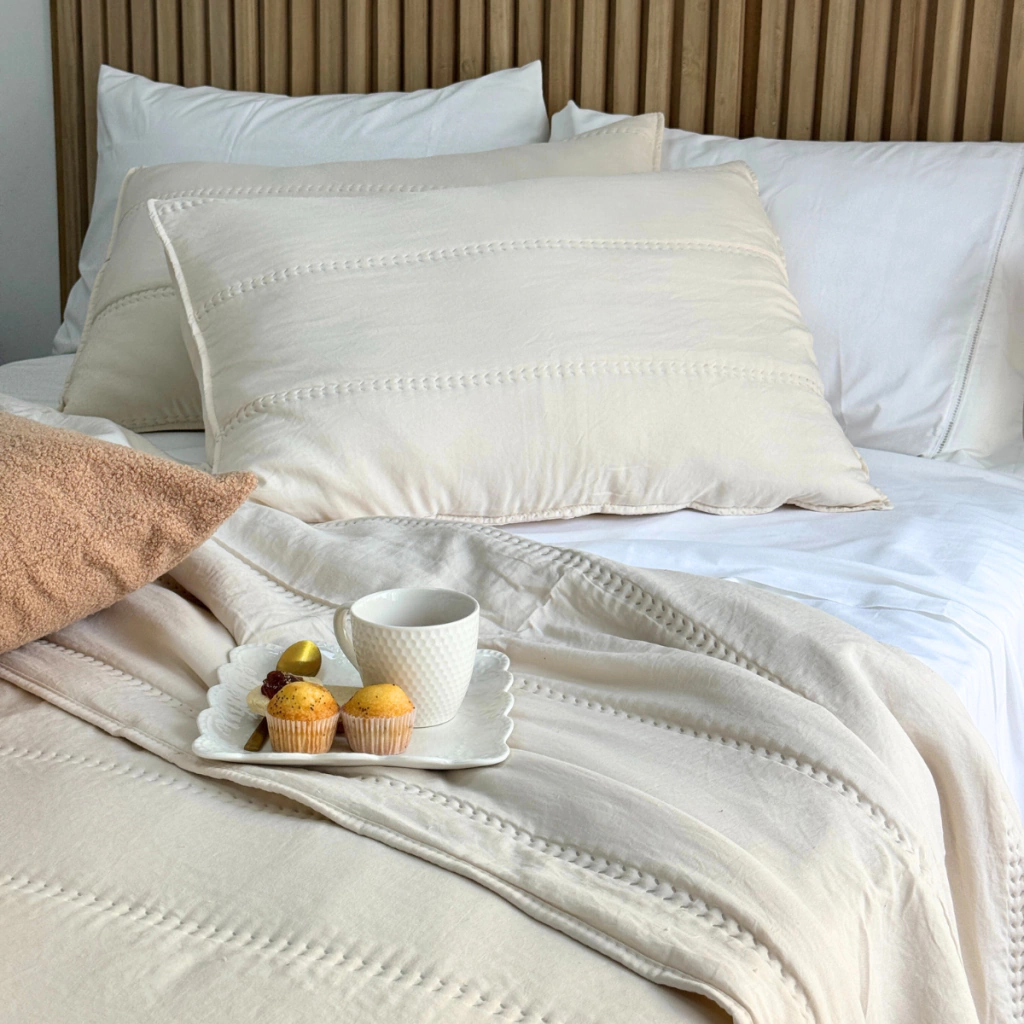 Hecho en microfibra soft touch de 85gr, lo que le da un tacto suave y sedoso. Relleno supersoft, liviano y aireado para darle cuerpo al cubrecama y linda caida a los lados.